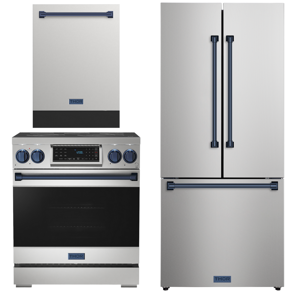 Gordon Ramsay by THOR Kitchen Package - 30" Electric Range, 30" Refrigerator with Ice Maker and Dishwasher in Stainless Steel with Navy Blue Accents, AP-RSE30-BLU-1