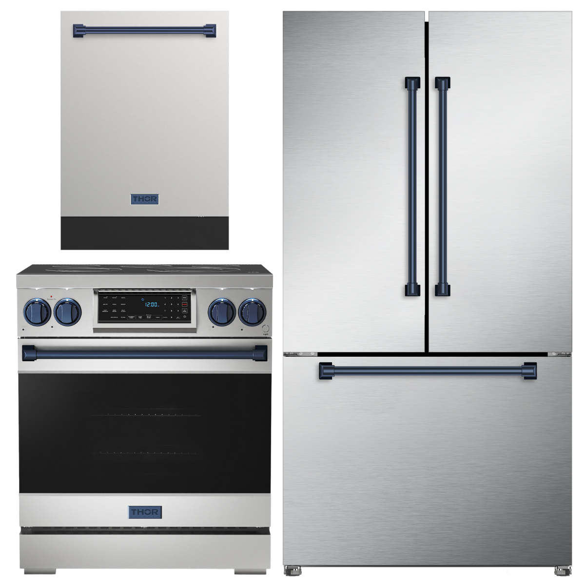 Gordon Ramsay by THOR Kitchen Package - 30" Electric Range, 36" Refrigerator with Ice Maker and Dishwasher in Stainless Steel with Navy Blue Accents, AP-RSE30-BLU-2