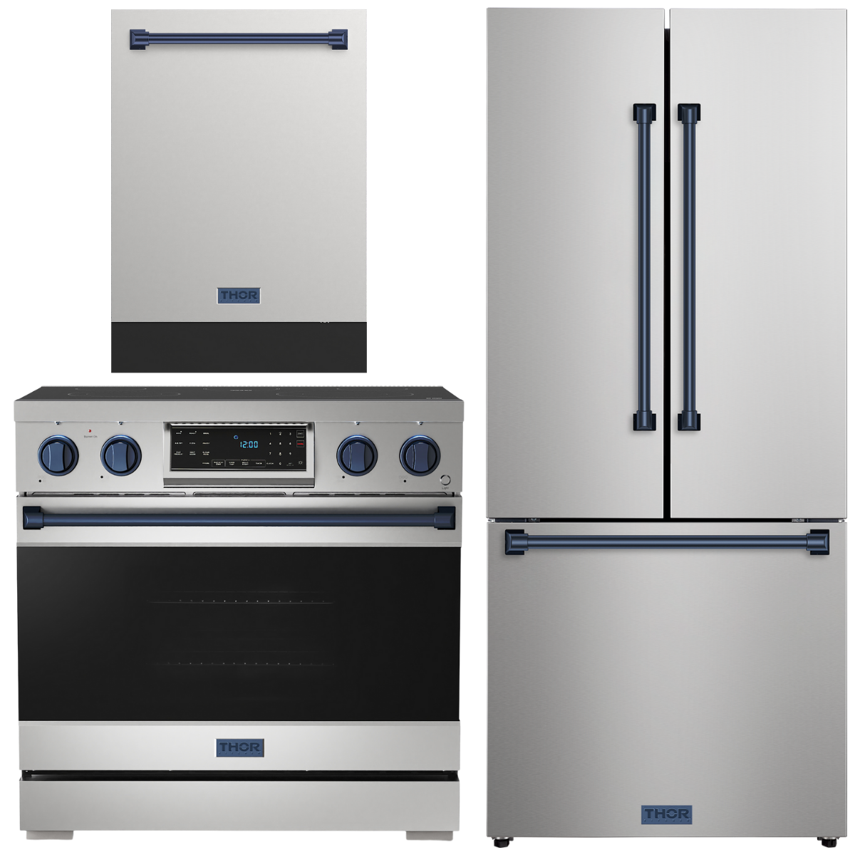 Gordon Ramsay by THOR Kitchen Package - 36" Electric Range, 30" Refrigerator with Ice Maker and Dishwasher in Stainless Steel with Navy Blue Accents, AP-RSE36-BLU-1