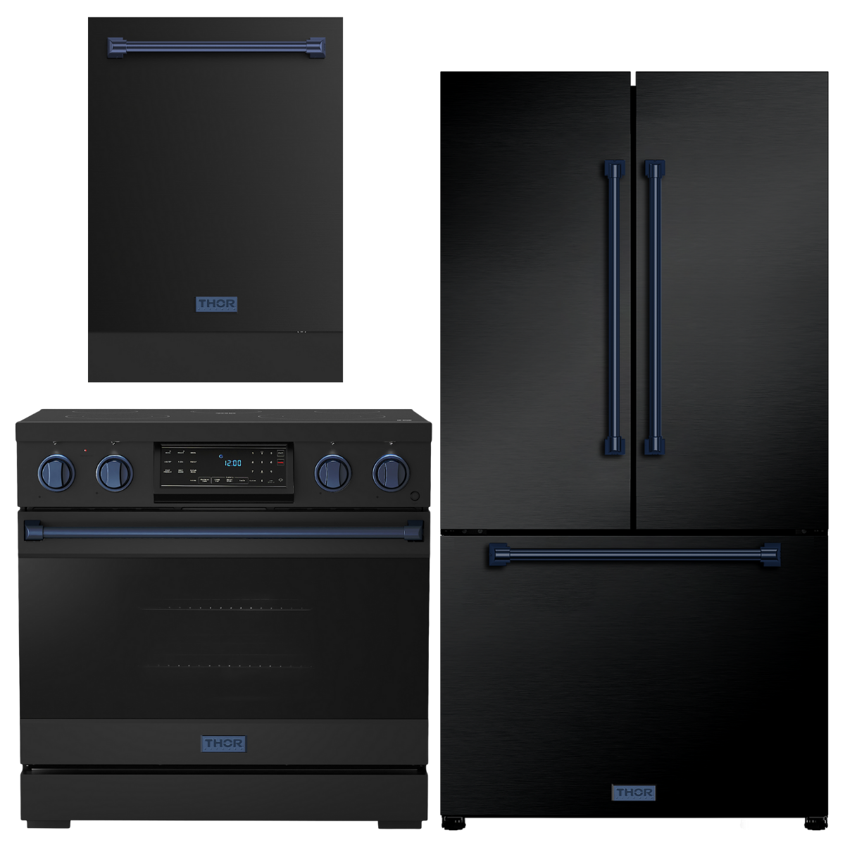 Gordon Ramsay by THOR Kitchen Package - 36" Electric Range, 36" Refrigerator with Ice Maker and Dishwasher in Black Matte with Navy Blue Accents, AP-RSE36B-BLU-2