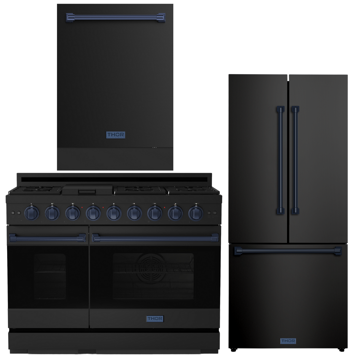 Gordon Ramsay by THOR Kitchen Package - 48" Gas Range, 30" Refrigerator with Ice Maker and Dishwasher in Black Matte with Navy Blue Accents, AP-RSG48EB-BLU-1