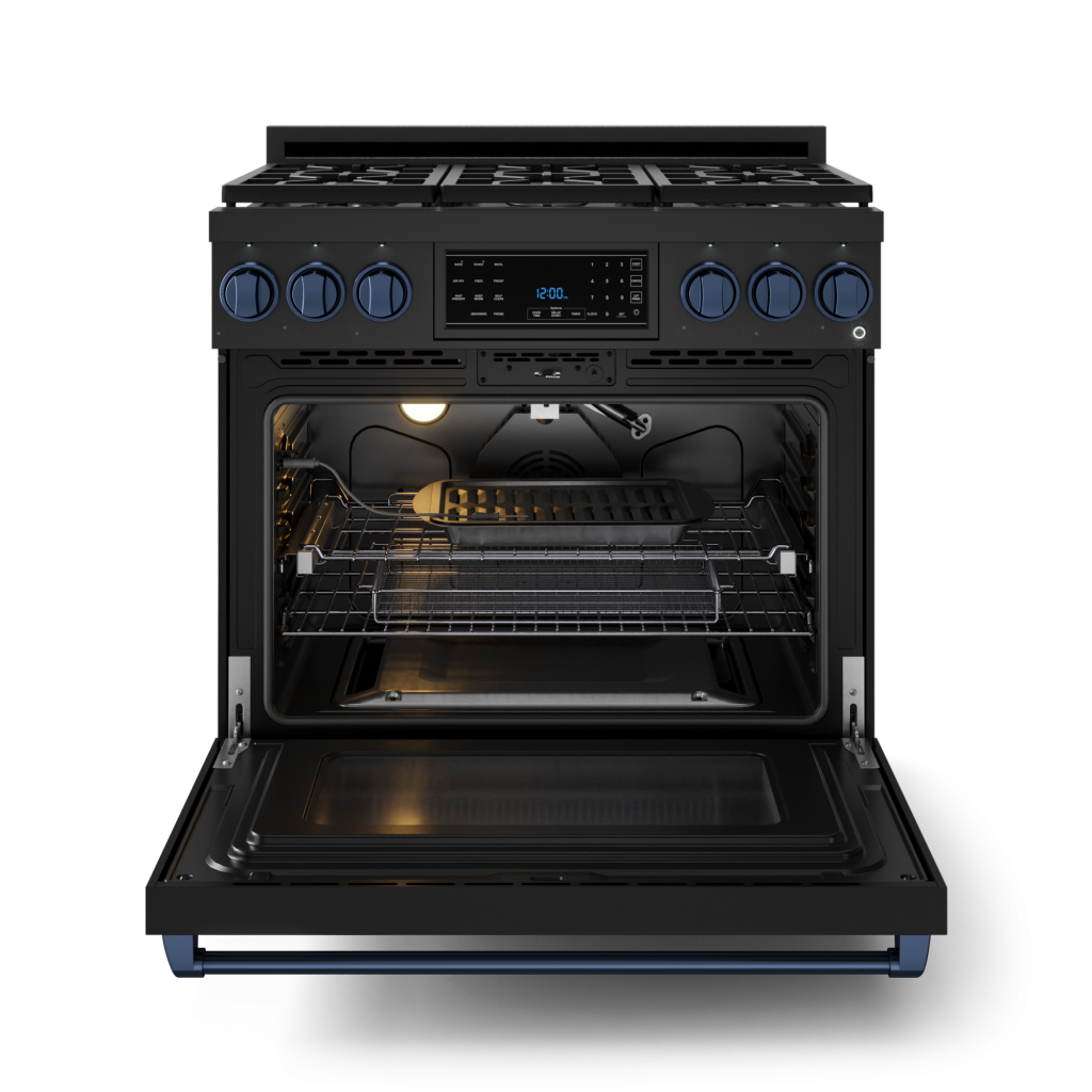 Gordon Ramsay by THOR Kitchen 36" 6.0 cu. ft. Professional Natural Gas Range with Tilt Panel Touch Control, Self-Clean and Air Fry in Matte Black with Navy Blue Accents, RSG36B-BLU
