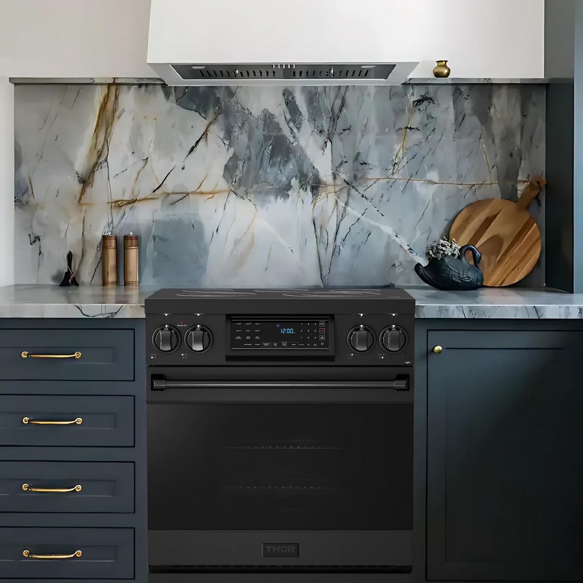 Gordon Ramsay by THOR Kitchen Package - 30" Electric Range, 30" Refrigerator with Ice Maker and Dishwasher in Black Matte with Black Accents, AP-RSE30B-1