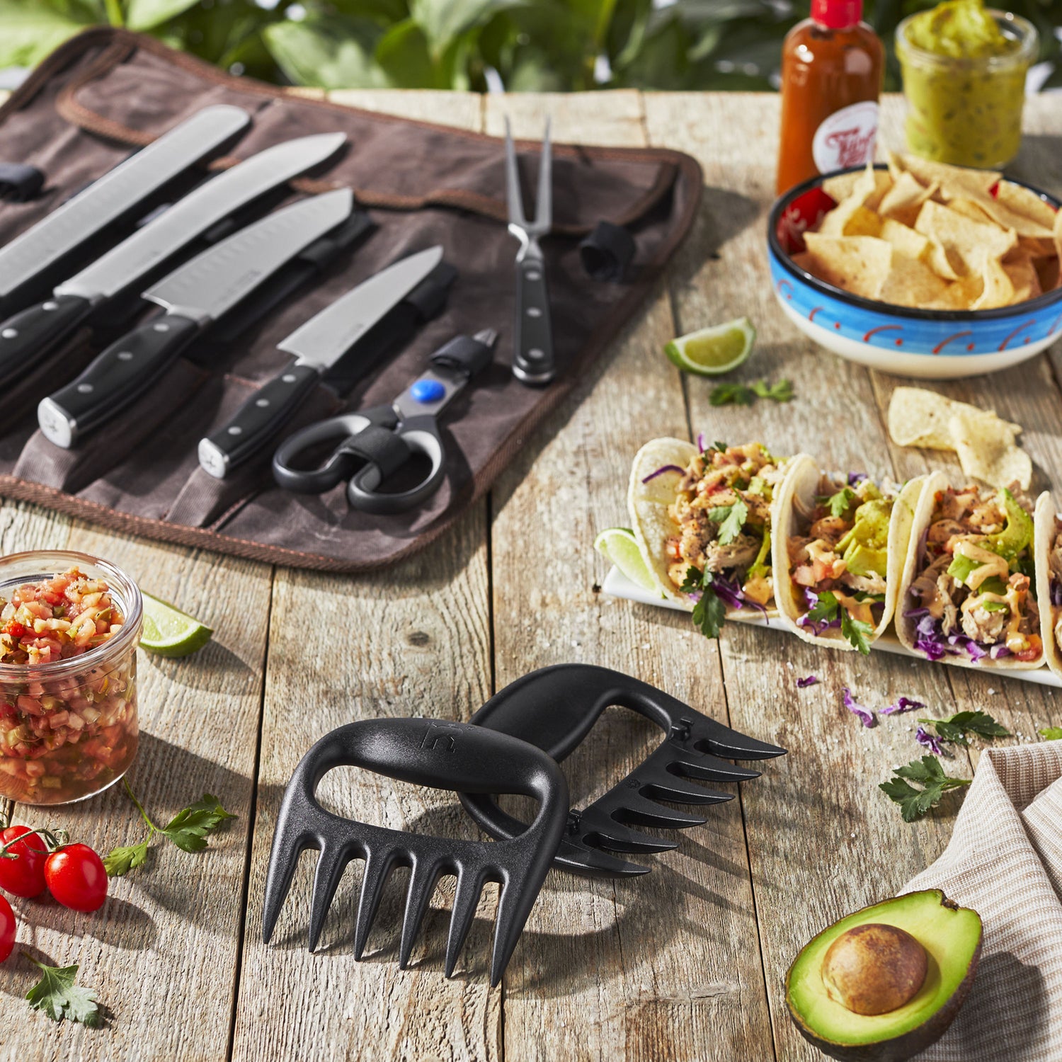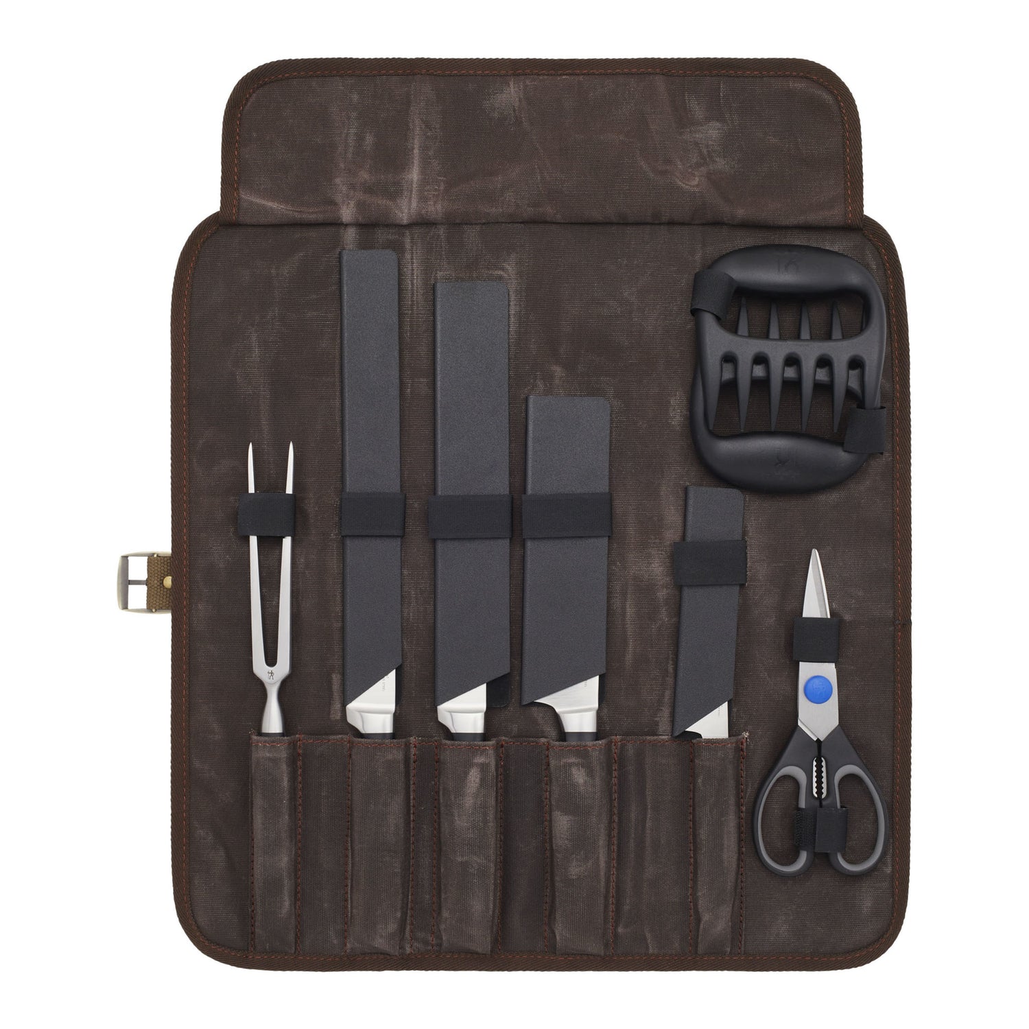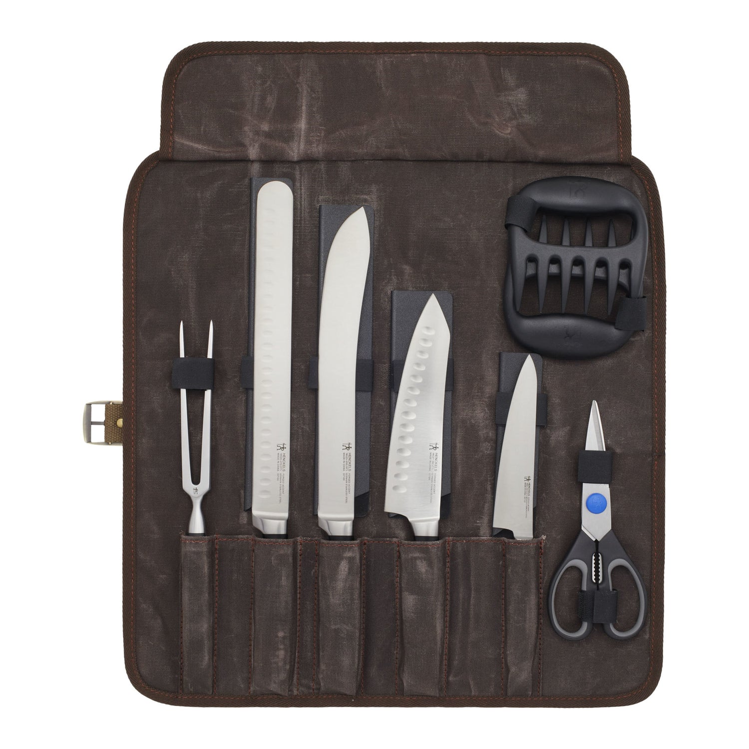 • Comprehensive Set. Our 9-piece collection includes an 11-inch buffet knife, 10-inch rib knife, 7-inch rocking santoku, 5.5-inch prep knife, carving fork, shears, a set of 2 bear claws, and a protective sheath for each blade, all housed in a handsome canvas roll bag