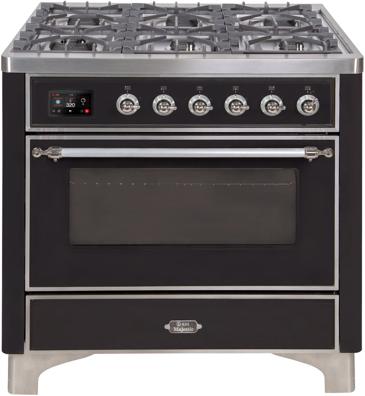 ILVE Majestic II 36" Dual Fuel Natural Gas Range in Glossy Black with Chrome Trim, UM09FDNS3BKC