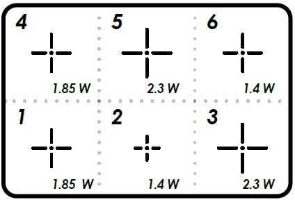 • Burner Output: Front Left - 2,500 WBack Left - 2,500 WBack Right - 1,800 WFront Right - 3,200 WMiddle Back - 3,200 WMiddle Front - 1,800 W
