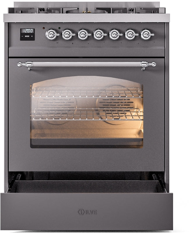 ILVE Nostalgie II 30" Dual Fuel Natural Gas Range in Matte Graphite with Chrome Trim, UP30NMPMGC