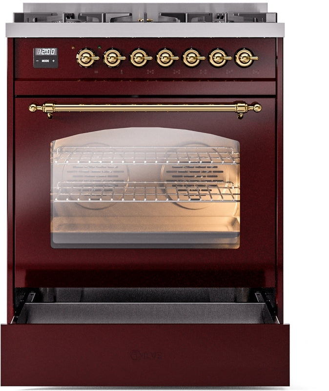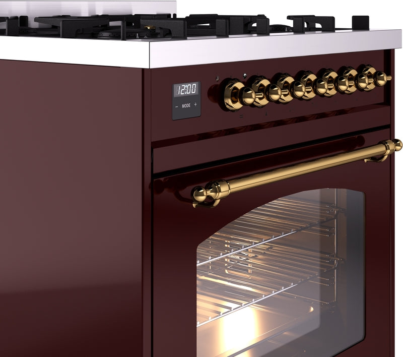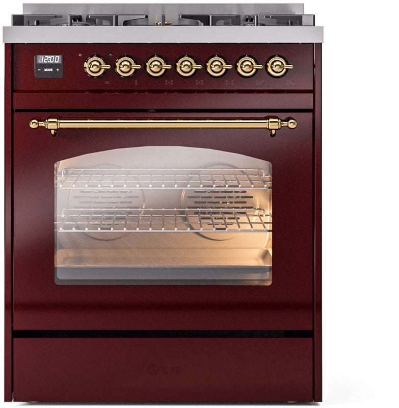 ILVE Nostalgie II 30" Dual Fuel Propane Gas Range in Burgundy with Brass Trim, UP30NMPBUGLP