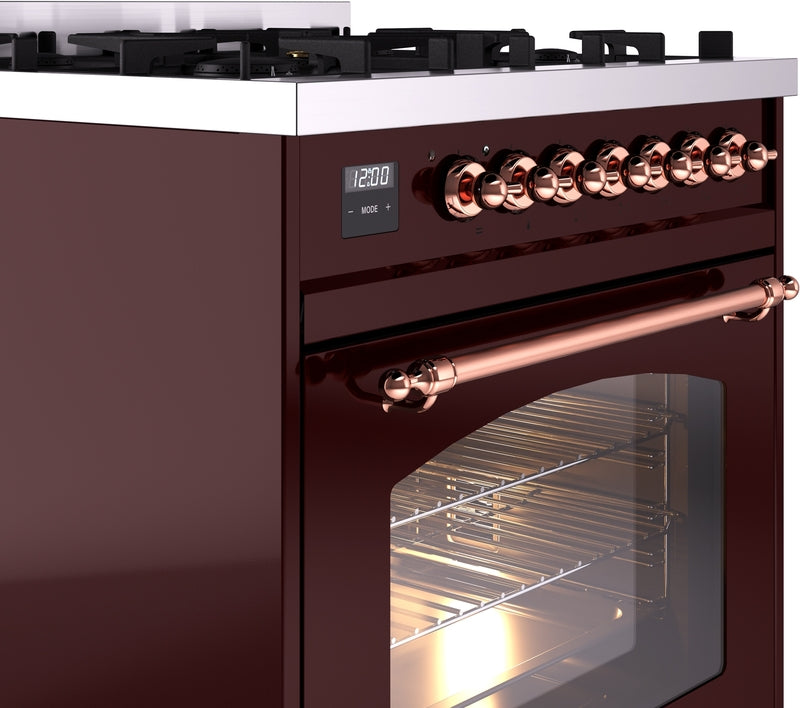 ILVE Nostalgie II 30" Dual Fuel Propane Gas Range in Burgundy with Copper Trim, UP30NMPBUPLP