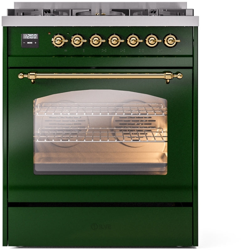 ILVE Nostalgie II 30" Dual Fuel Propane Gas Range in Emerald Green with Brass Trim, UP30NMPEGGLP