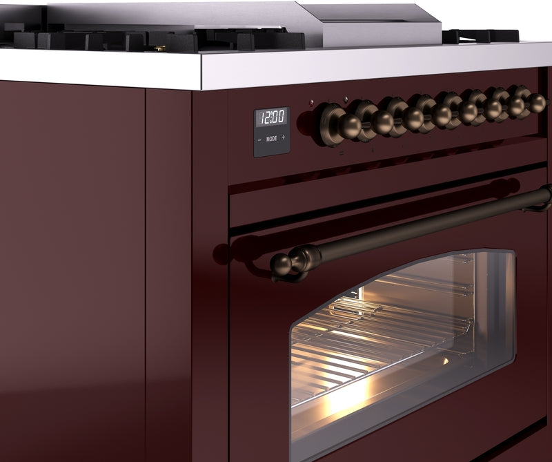 ILVE Nostalgie II 36" Dual Fuel Natural Gas Range in Burgundy with Bronze Trim, UP36FNMPBUB