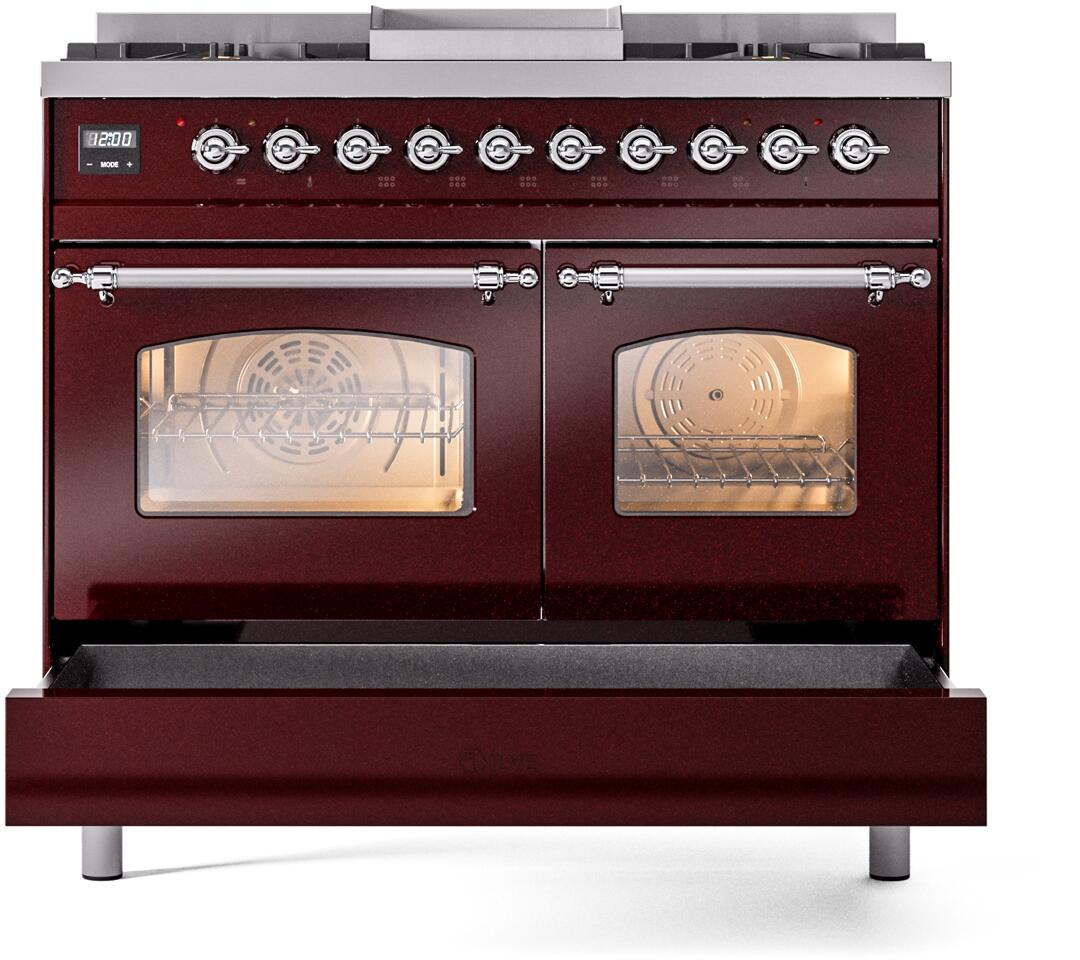 ILVE Nostalgie II 40" Dual Fuel Natural Gas Range in Burgundy with Chrome Trim, UPD40FNMPBUC