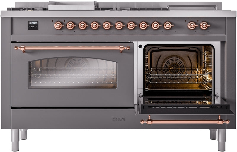 ILVE Nostalgie II 60" Dual Fuel Natural Gas Range in Matte Graphite with Copper Trim, UP60FSNMPMGP
