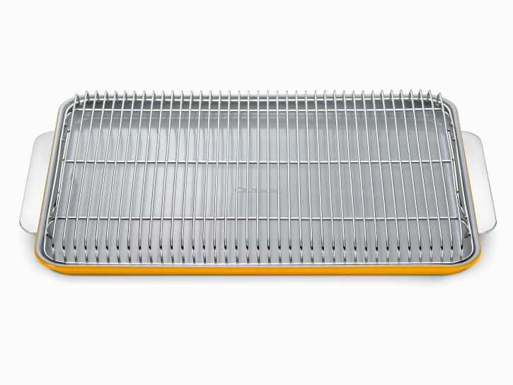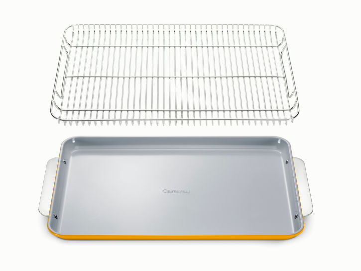 Meet your ultimate baking companion – the Large Baking Sheet & Cooling Rack Duo, tailored to cater to all your baking essentials. Simplify your culinary journey with this dynamic duo designed to elevate your kitchen experience. Crafted to perfection, the 18" x 13" Large Baking Sheet boasts a non-toxic, naturally smooth ceramic surface, while its dimensions perfectly accommodate the 18" x 13" stainless steel Cooling Rack, allowing seamless nesting.