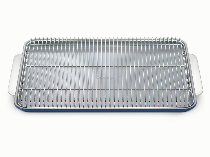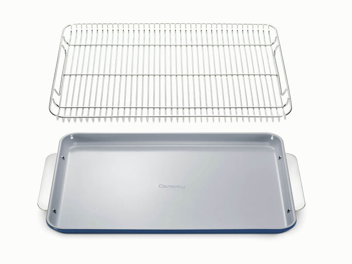 Meet your ultimate baking companion – the Large Baking Sheet & Cooling Rack Duo, tailored to cater to all your baking essentials. Simplify your culinary journey with this dynamic duo designed to elevate your kitchen experience. Crafted to perfection, the 18" x 13" Large Baking Sheet boasts a non-toxic, naturally smooth ceramic surface, while its dimensions perfectly accommodate the 18" x 13" stainless steel Cooling Rack, allowing seamless nesting.
