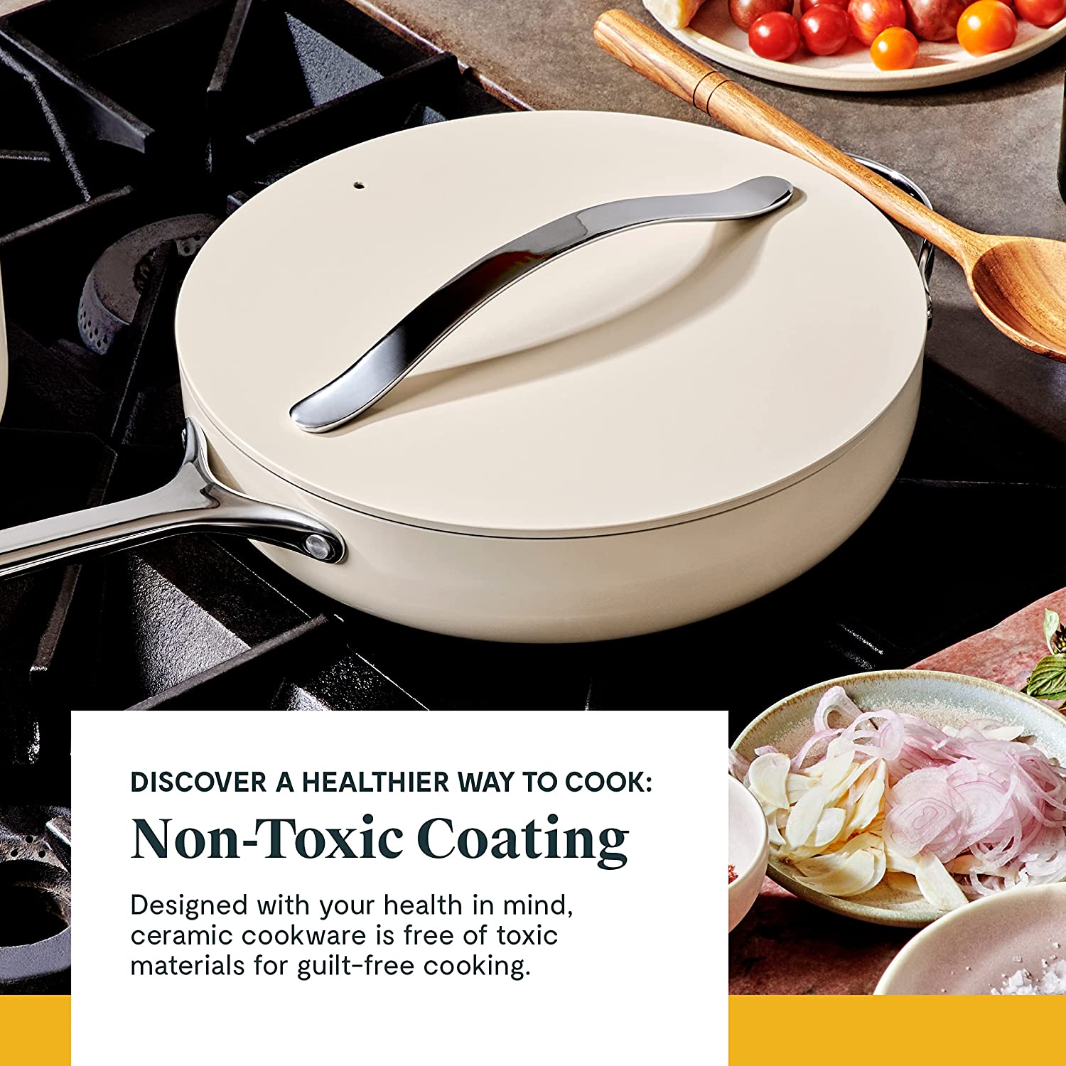 The Caraway ceramic Sauté Pan (lid included) allows for healthy cooking in the kitchen without harmful chemicals: use for dishes with stock, dinner parties, and more. Featuring a non-toxic ceramic-coated interior, this durable non-stick pan makes cooking easier than ever, cleaning (dare we say) enjoyable, and adds a pop of color to any home.
