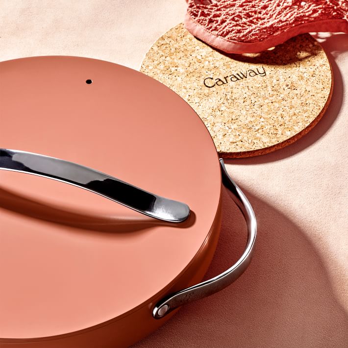 The Caraway ceramic Sauté Pan (lid included) allows for healthy cooking in the kitchen without harmful chemicals: use for dishes with stock, dinner parties, and more. Featuring a non-toxic ceramic-coated interior, this durable non-stick pan makes cooking easier than ever, cleaning (dare we say) enjoyable, and adds a pop of color to any home.