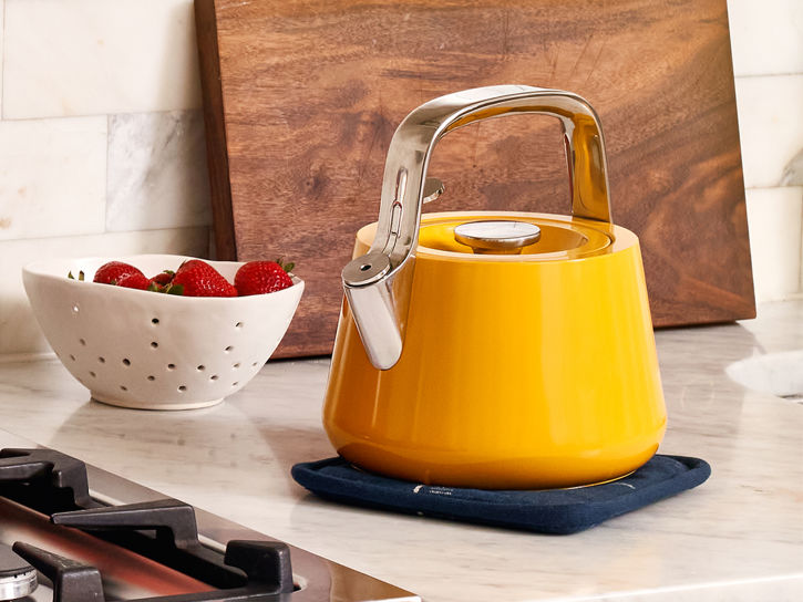 Meet your next Whistling Tea Kettle. Caraway’s Whistling Tea Kettle is a modern take on the classic kitchen essential, constructed with non-toxic materials to keep your boiled water clean and free of harmful chemicals. As easy on the eyes as it is on the ears, our durable stainless steel Tea Kettle is one worth whistling at. The beautiful and unique design will have your friends and family jealous of the marigold-colored exterior and stainless steel handles...and yes...it's designed for fast boiling :)