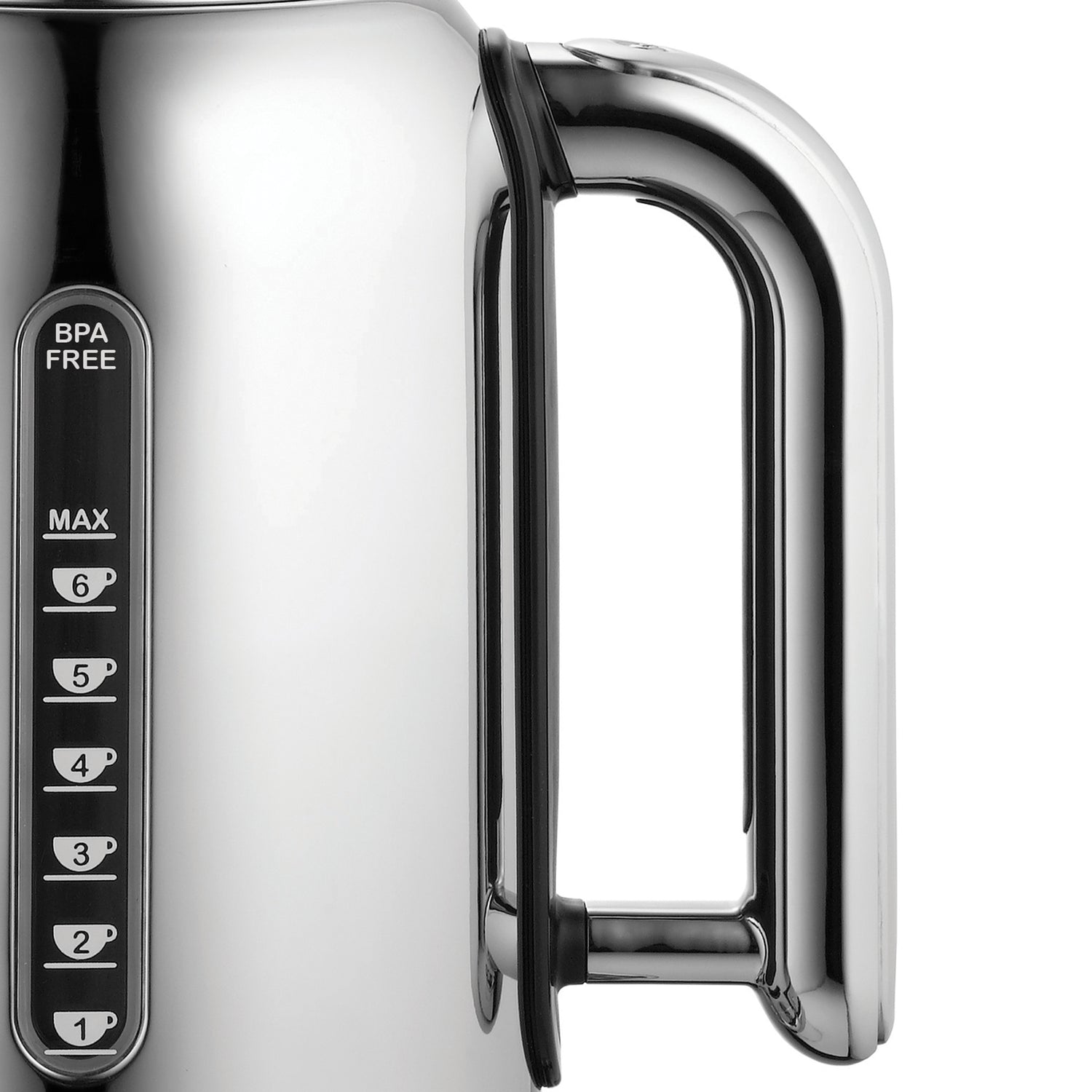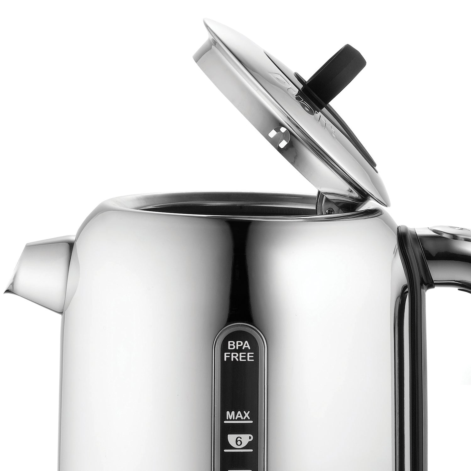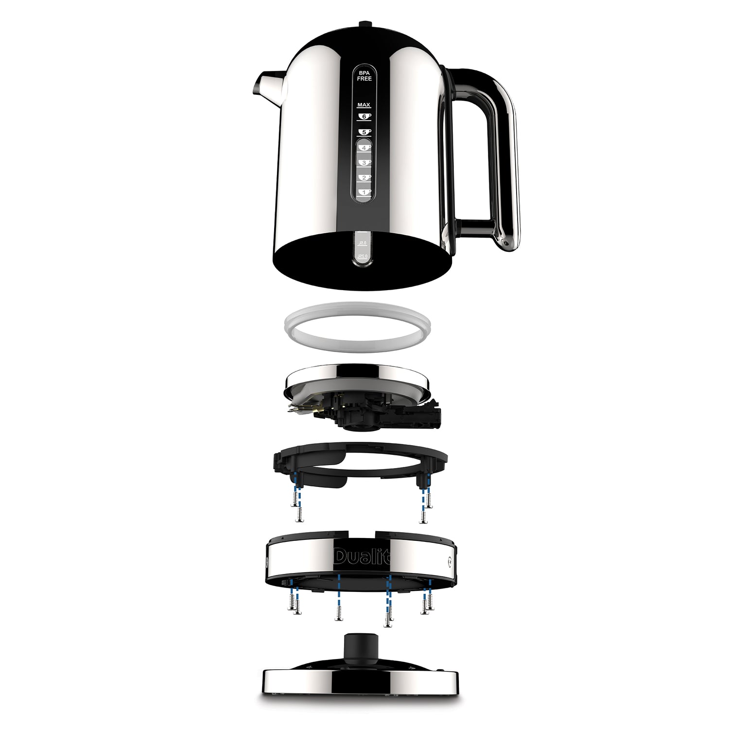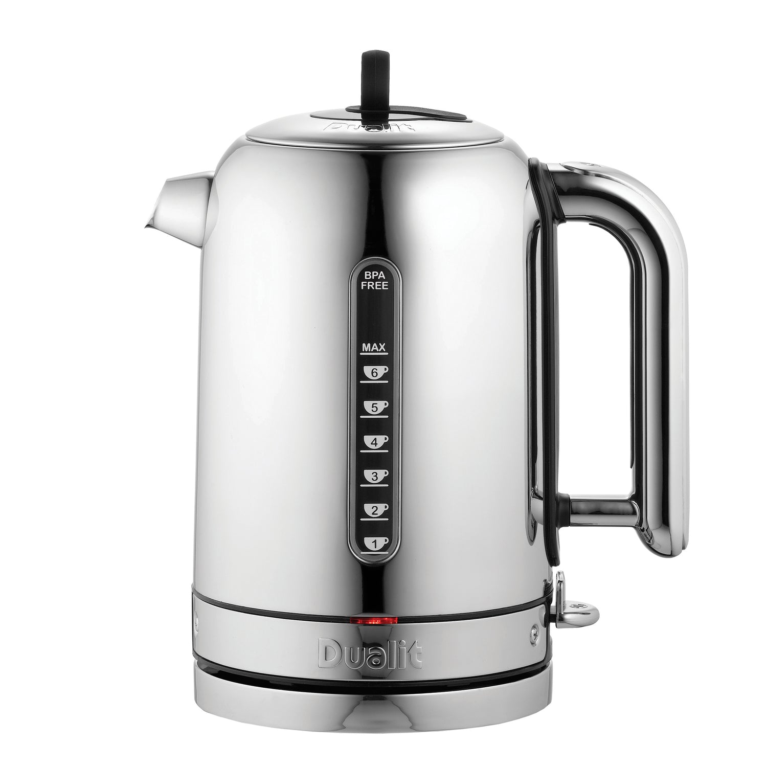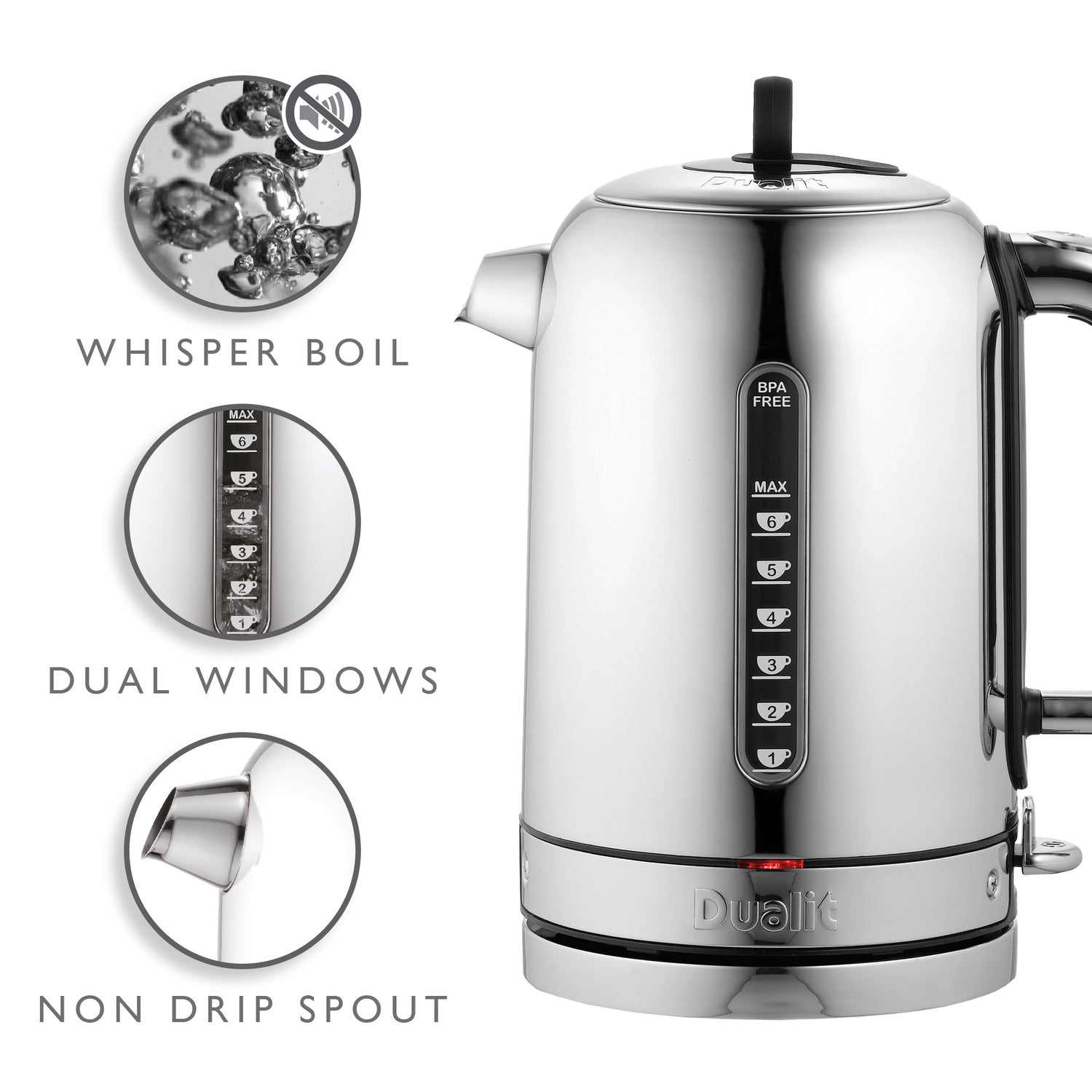 Introducing Dualit's Classic Kettle, a timeless design featuring innovative patented technologies for a superior boiling experience. The Whisper Boil™ technology ensures a remarkably quiet boiling process, complemented by anti-wobble feet that enhance stability on any surface. The cordless operation, combined with a sturdy large handle, offers convenience during use and easy cleaning. Crafted with a polished chrome housing, this kettle boasts two measuring windows with cup and liter indicators, allowing precision from a single cup to 1.7 liters. Perfectly coordinated with Dualit NewGen Classic Toasters, this kettle is not just a kitchen essential; it's a statement.