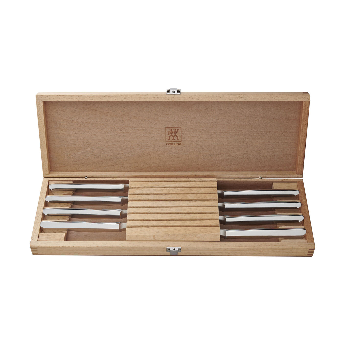 Introducing the ZWILLING 8pc Stainless Steel Serrated Steak Knife Set with a Wood Presentation Case: Elevate your dining and hosting with this exceptional set of steak knives, thoughtfully packaged in an elegant wood presentation case.