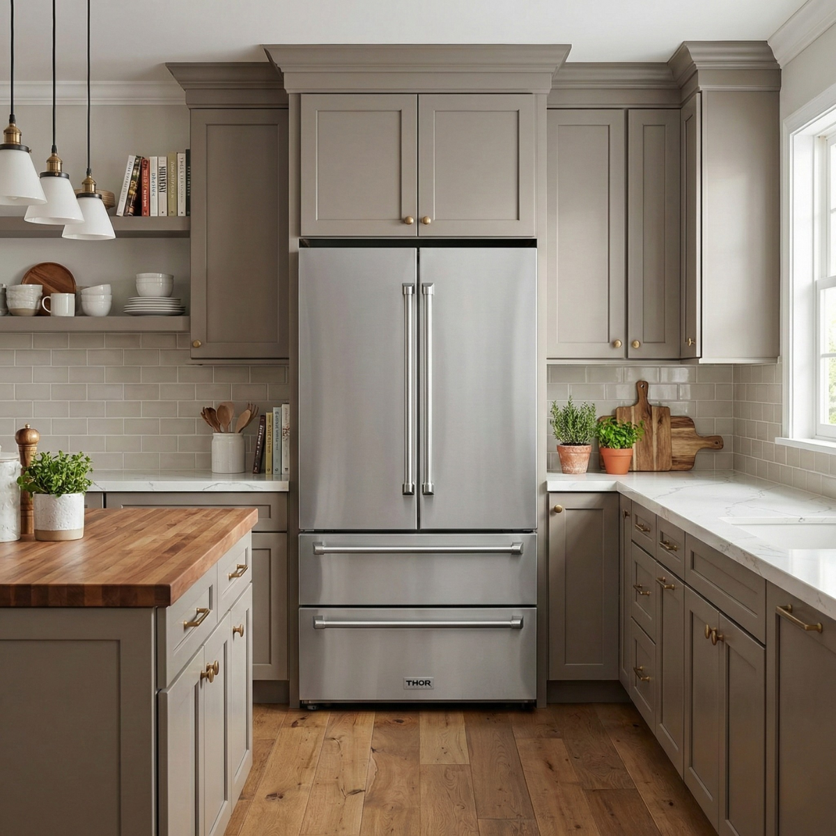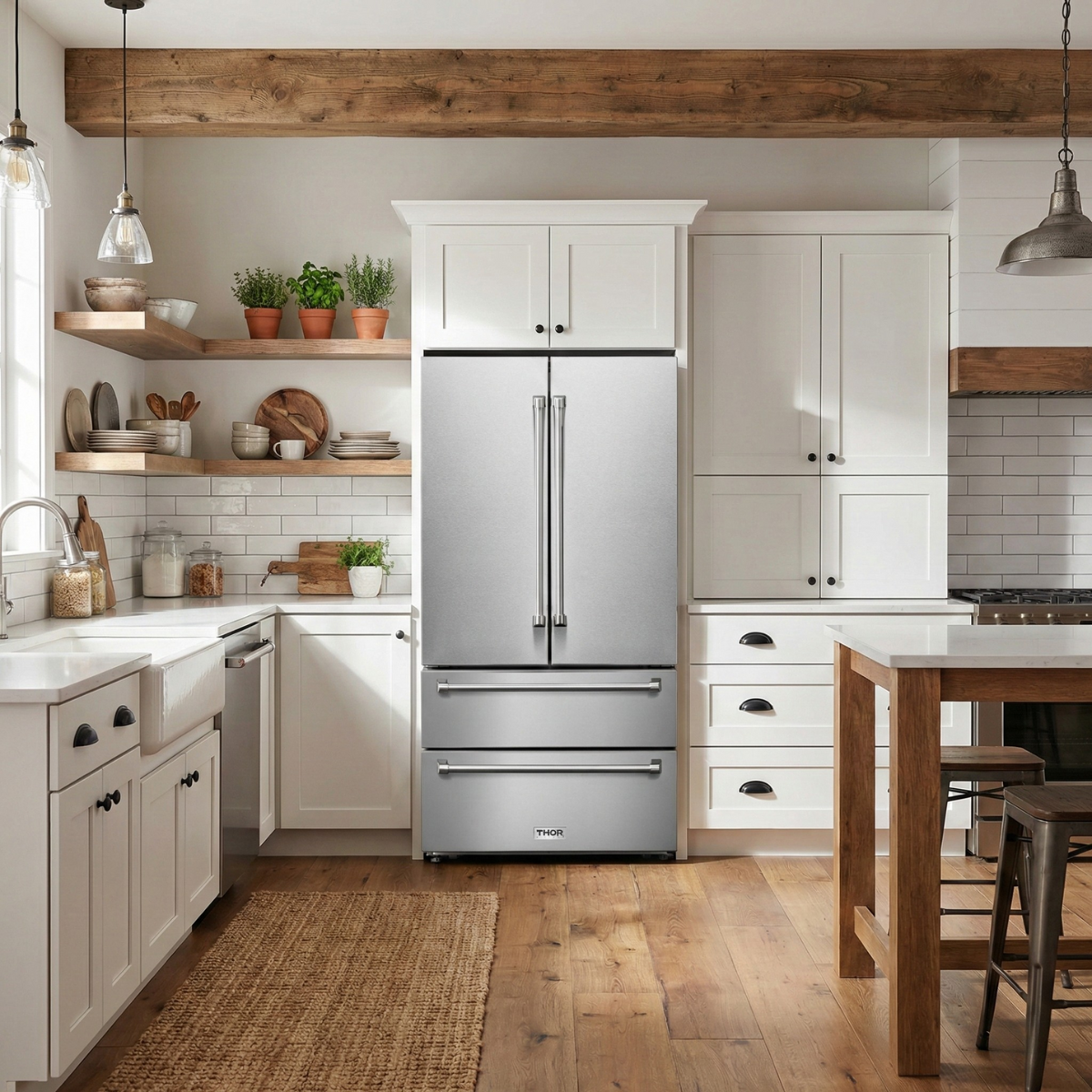 Thor Kitchen's 36 Inch Professional French Door Refrigerator with two separate Freezer Drawers provides ample storage and keeps everything as cool, crisp, cold and/or frozen as the recipe calls for. Moisture, odor transfer and freezer burn? Gone. Compliments on meals? Way, way up.