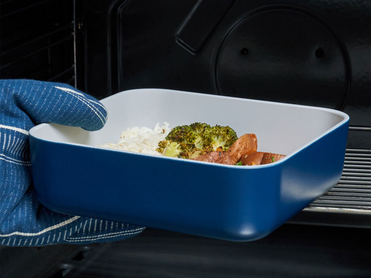 • Safe In: Microwave (not container lids or inserts) Refrigerator // Oven (Up to 450ºF, never broil) // Freezer