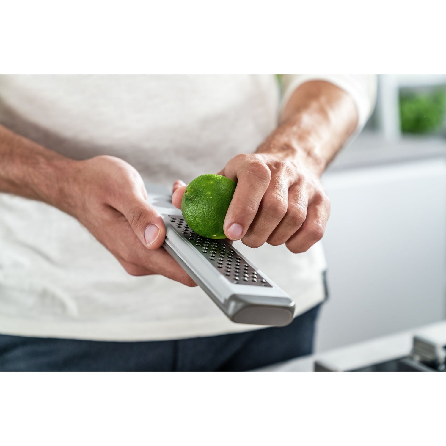 The fine grater is designed for grating and zesting everything from hard cheeses to citrus. The removable food storage tray cleanly catches grated food below the grating area. If you’d prefer to grate directly over food, the tray can be quickly and easily removed. And the handy food holder/finger guard attachment makes grating small pieces of food safe and efficient.