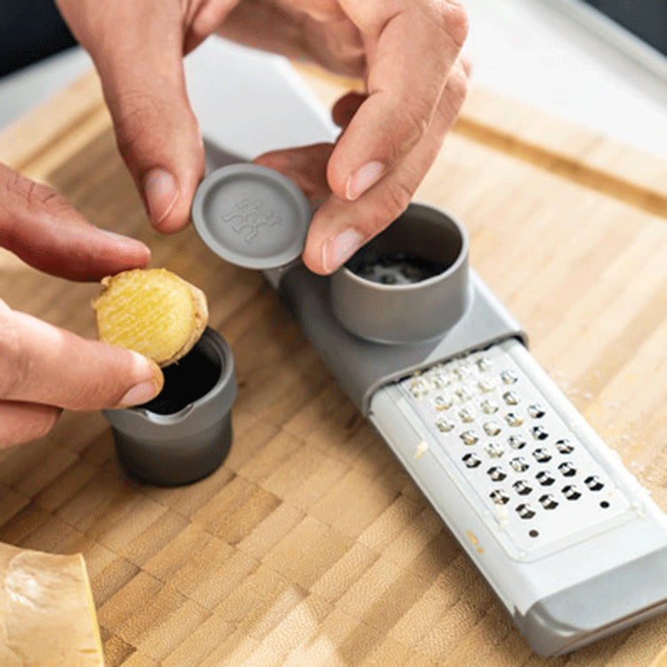 • Removable food storage tray: cleanly collect grated food below grating area or remove to grate directly onto dishes