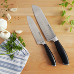 Upgrade your kitchen arsenal with the Elan 2-Piece Asian Knife Set. Perfect for everyday cooking tasks, this duo features 7-inch and 5-inch Santoku knives. Experience precision and style:
