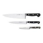 Meal prep is easy with this HENCKELS Classic 3-piece starter knife set. Honed for long-lasting sharpness, the fine-edge blades are perfect for precision cuts. Effortlessly chop herbs with the 8-inch chef's knife, slice cheese with the 6-inch utility knife, and peel apples with the 4-inch paring/utility knife.