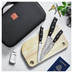 • Convenient Travel Bag. Housed in a durable hard case bag, this set is designed for on-the-go convenience. Store your knives securely in the mesh slots and fasten them with Velcro straps