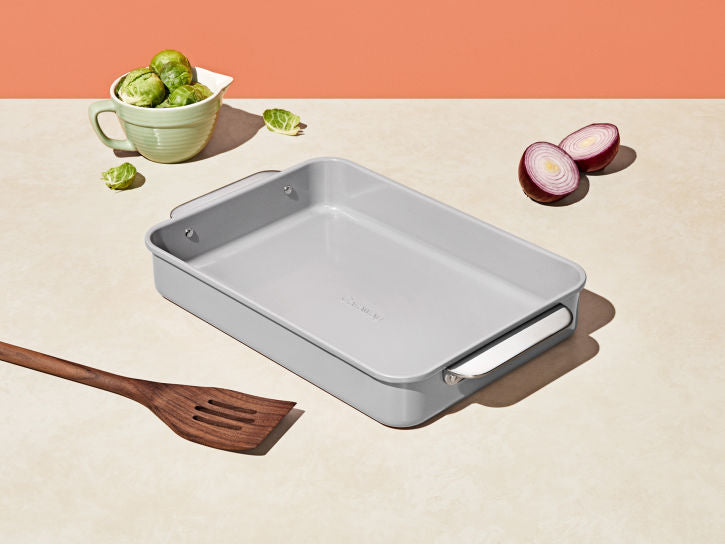 Meet the healthiest Rectangle Pan by Caraway. The 9x13" Rectangle Pan in Gray enables you to bake goods without any of the bads: use for all your favorites like brownies, lasagnas, and more. Featuring a non-toxic, naturally slick ceramic coating, this durable pan makes healthy baking (and clean up) easier than ever.