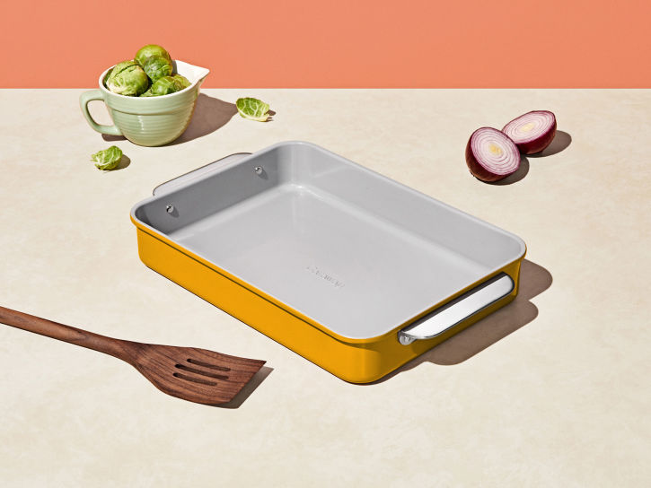Meet the healthiest Rectangle Pan by Caraway. The 9x13" Rectangle Pan in Marigold enables you to bake goods without any of the bads: use for all your favorites like brownies, lasagnas, and more. Featuring a non-toxic, naturally slick ceramic coating, this durable pan makes healthy baking (and clean up) easier than ever.