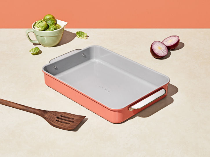 Meet the healthiest Rectangle Pan by Caraway. The 9x13" Rectangle Pan in Perracotta enables you to bake goods without any of the bads: use for all your favorites like brownies, lasagnas, and more. Featuring a non-toxic, naturally slick ceramic coating, this durable pan makes healthy baking (and clean up) easier than ever.