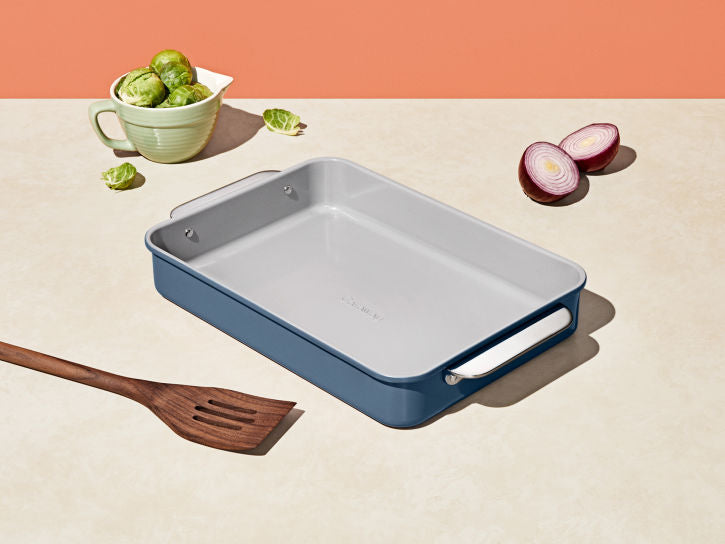 Meet the healthiest Rectangle Pan by Caraway. The 9x13" Rectangle Pan in Slate enables you to bake goods without any of the bads: use for all your favorites like brownies, lasagnas, and more. Featuring a non-toxic, naturally slick ceramic coating, this durable pan makes healthy baking (and clean up) easier than ever.