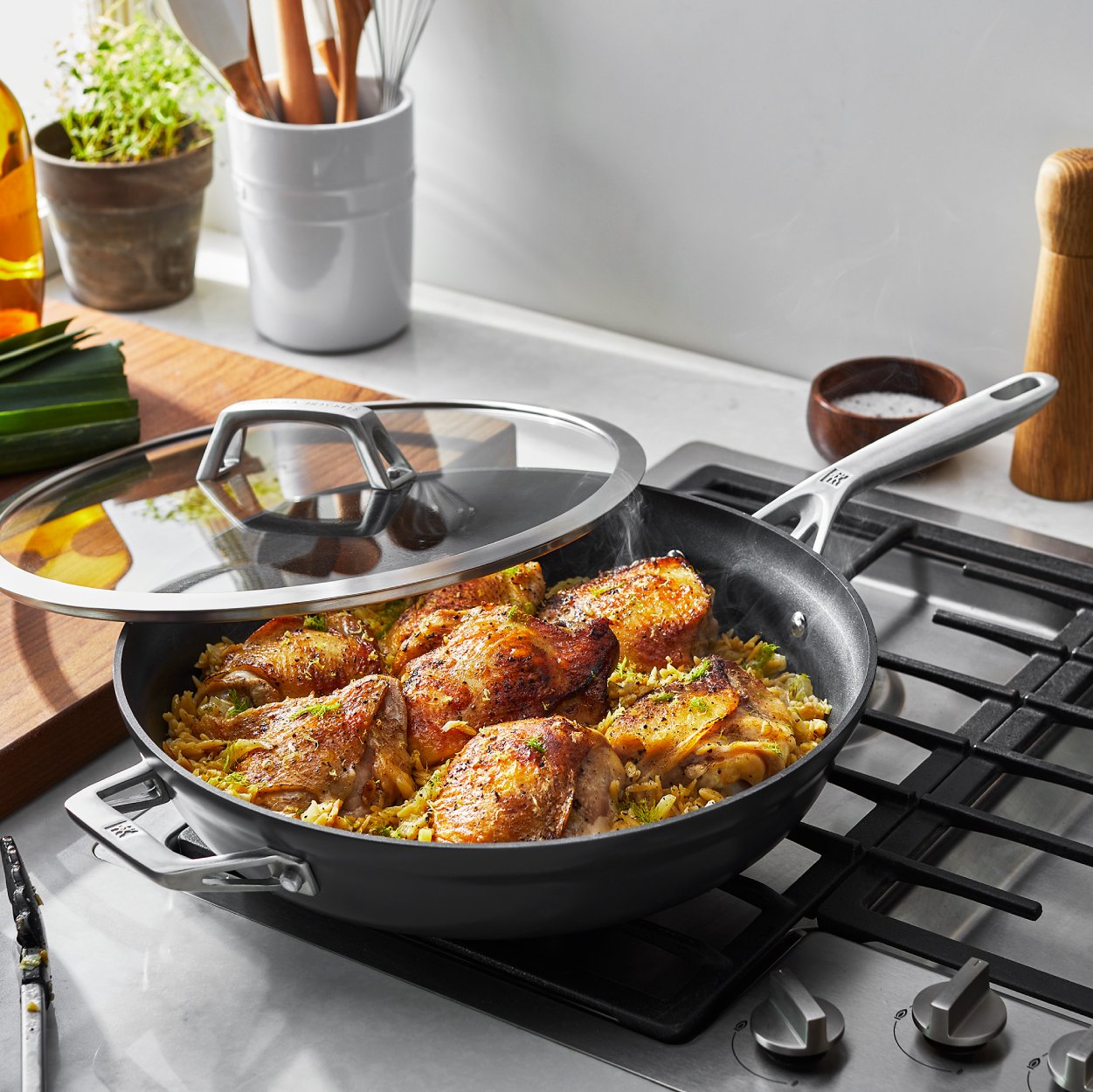 Make tender chicken thighs, homemade meatballs, and delicious one-pan meals in this versatile pan that is ideal for large-batch cooking. Lock in moisture with the tempered glass lid that’s ideal for steaming and easy food monitoring.