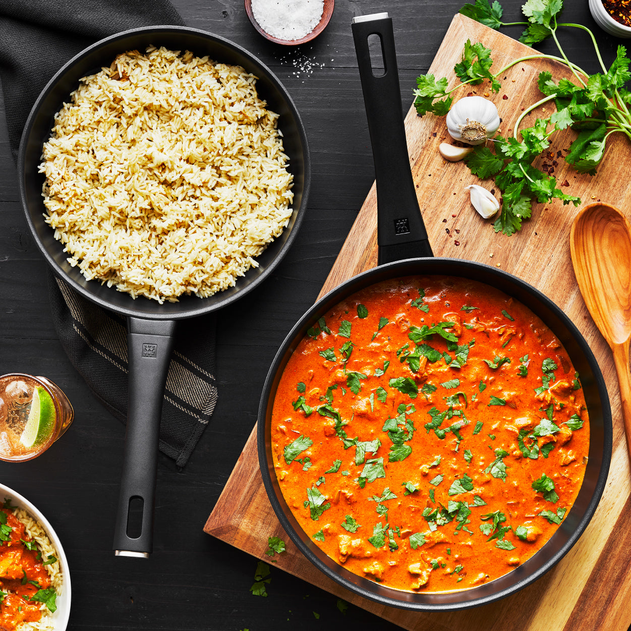 • 8-inch slate grey fry pan perfectly proportioned for cooking for one