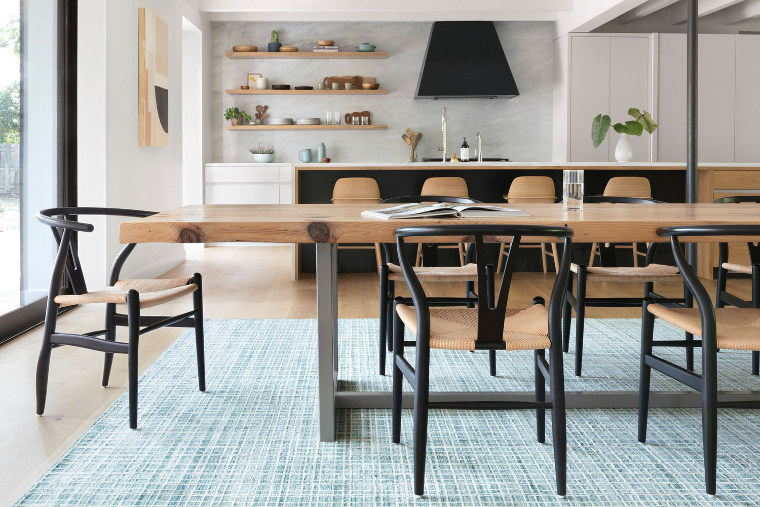 • Viscose and wool yarns are hand-loomed by artisans to create our high-pile indoor rug.
