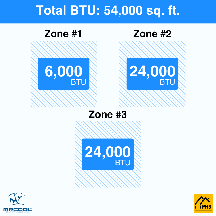 • Capacity: Total: 54,000 BTU//Zone 1: 6,000 BTU//Zone 2: 24,000 BTU//Zone 3: 24,000 BTU