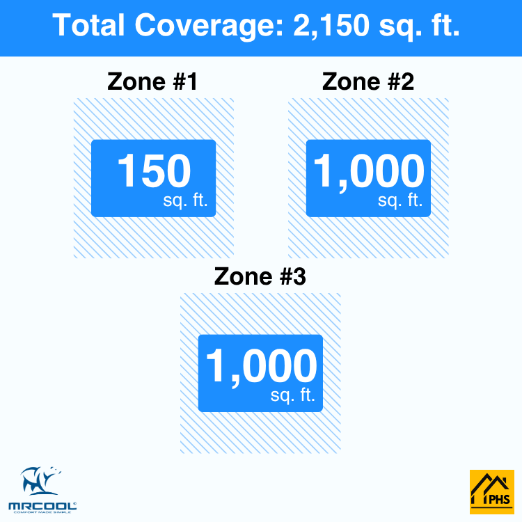 • Coverage Area: Total: 2,150 sq. ft.//Zone 1: 150 sq. ft.//Zone 2: 1,000 sq. ft.//Zone 3: 1,000 sq. ft.