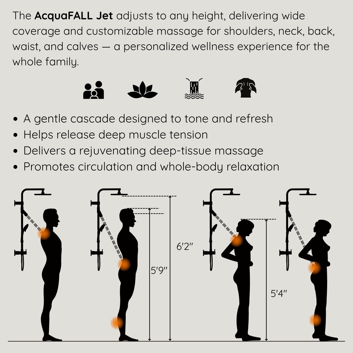 • AcquaFALL Waterfall Jet: Innovative 10-1/2" outlet with 3 spray modes and adjustable angle for calming relief.
