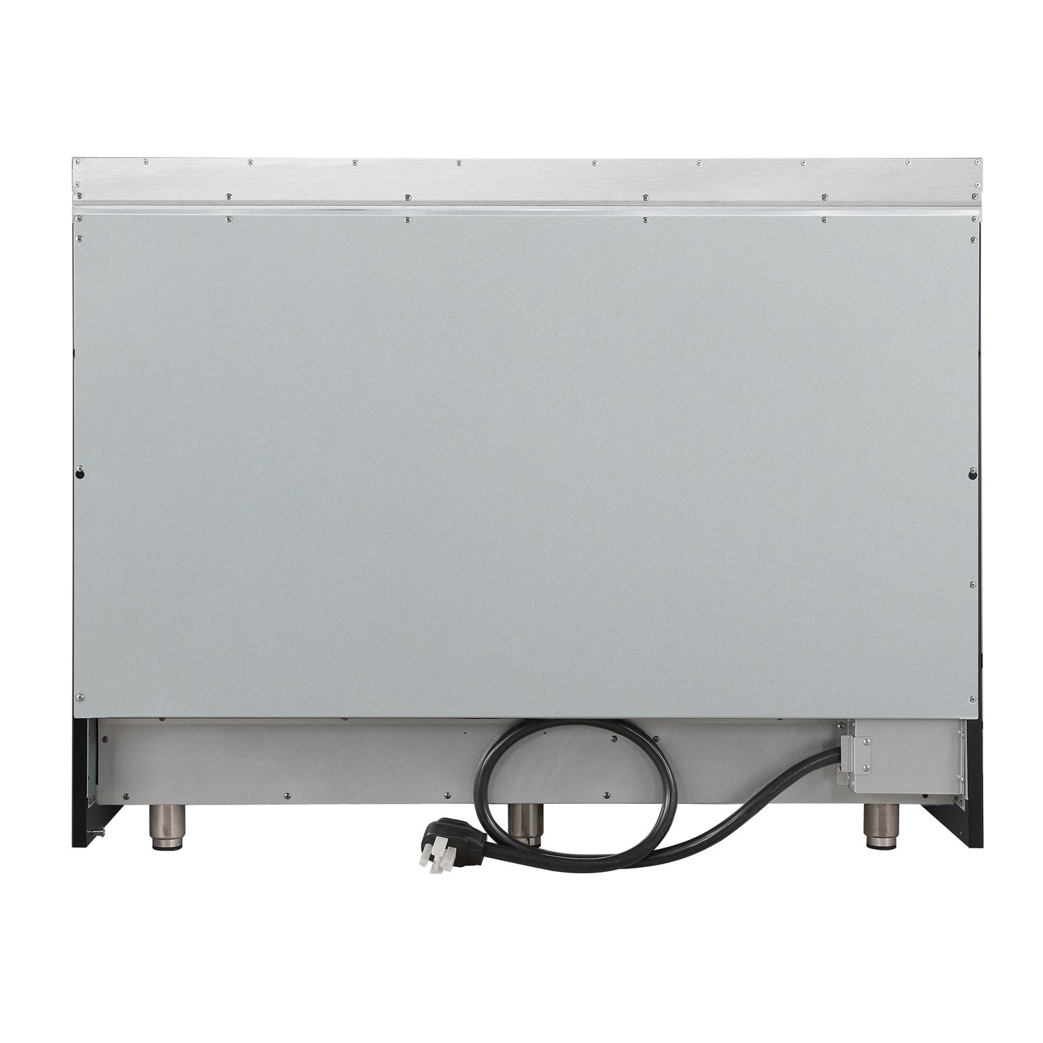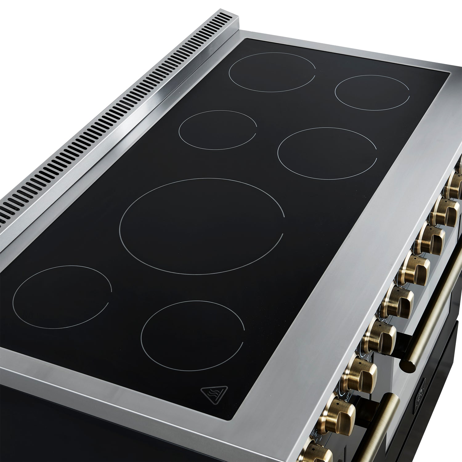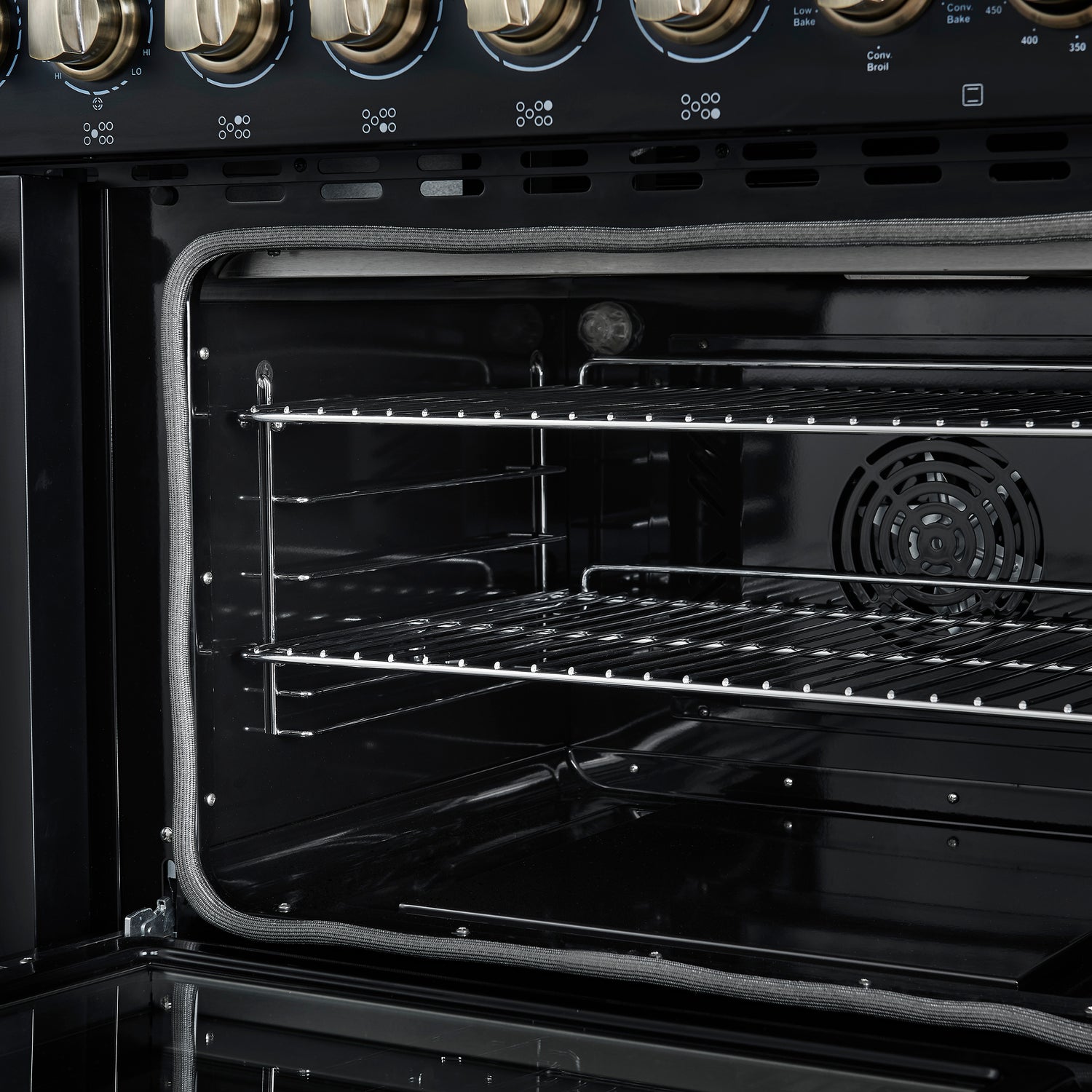 The Forno Paolo 48" Freestanding Electric Range in Black with Antique Brass knobs and handles blends power with classic style. Its smooth ceramic glass cooktop offers seven radiant elements totaling 11,000 watts, while dual ovens totaling 6.70 cu. ft. use true convection with a 1,200-watt element and 3,000 watts of baking and broiling power for fast, even results. Convenience features include a hidden bake element for easier cleanup, bright halogen lighting, a large viewing window, a precise dual-element broiler, and a 100-watt warming zone to keep dishes at serving temperature.