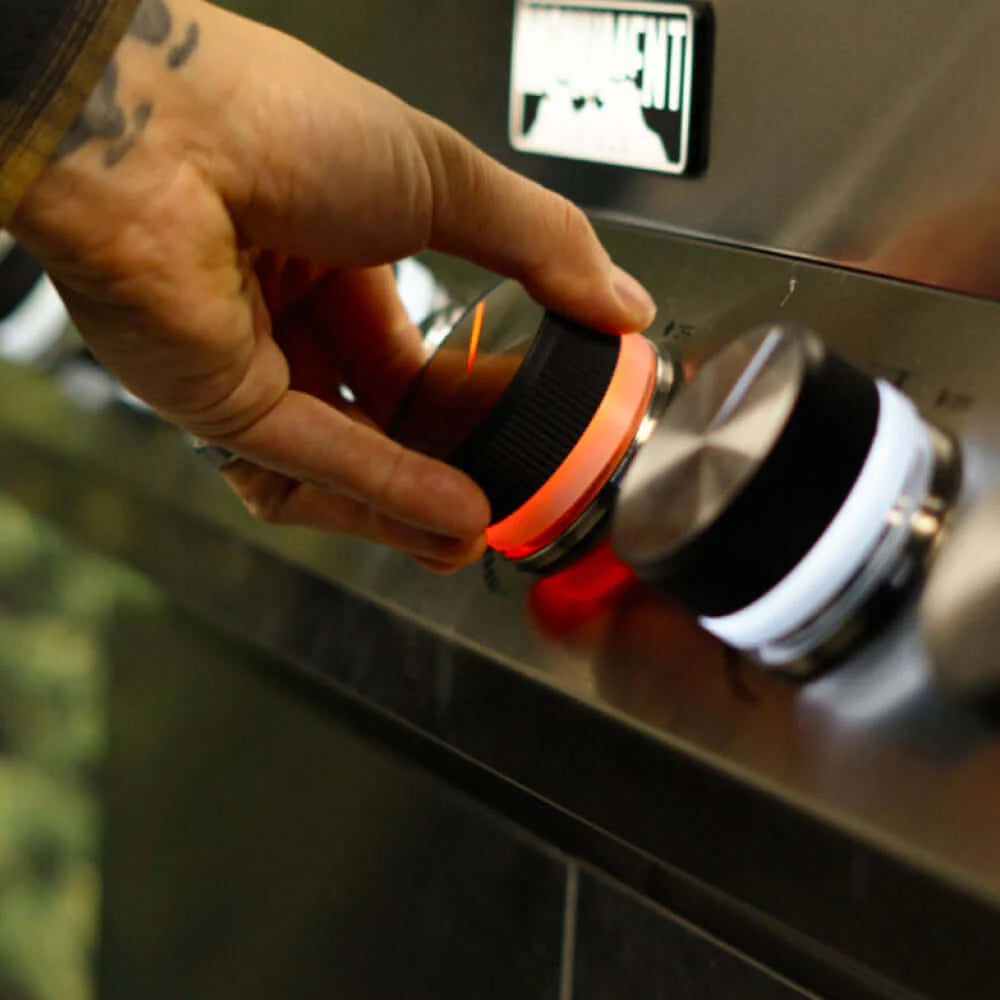 Multi-color changing LED knobs that show burner status and heat levels with white, orange, or red lights, adding a modern touch. -