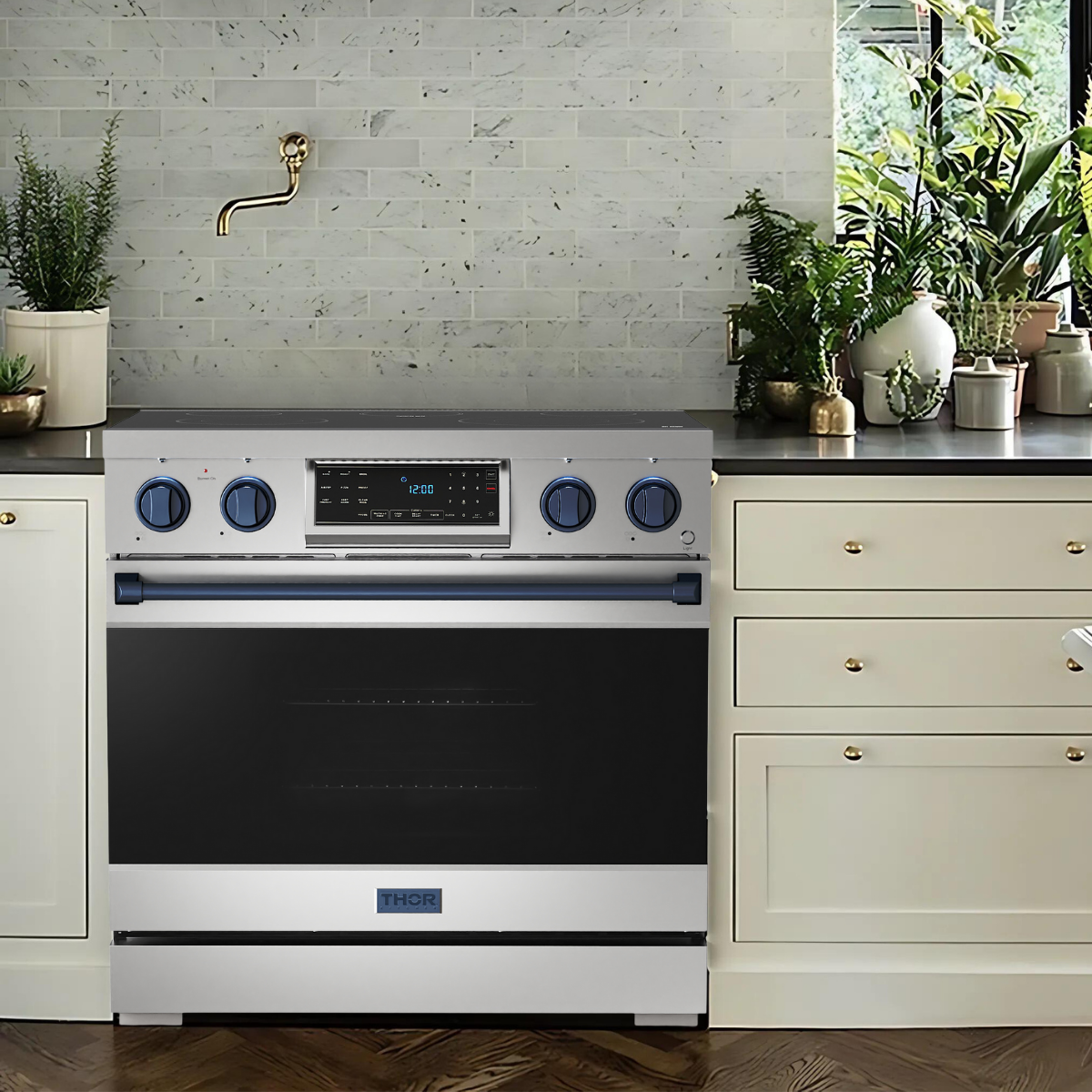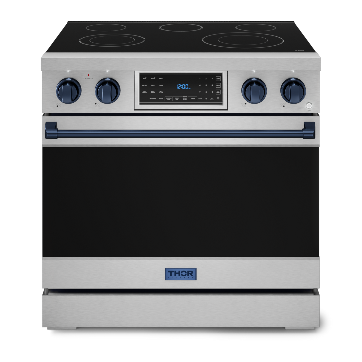 Gordon Ramsay by THOR Kitchen 36" 6.0 cu. ft. Professional Electric Range with Tilt Panel Touch Control, Self-Clean and Air Fry in Stainless Steel with Navy Blue Accents, RSE36-BLU