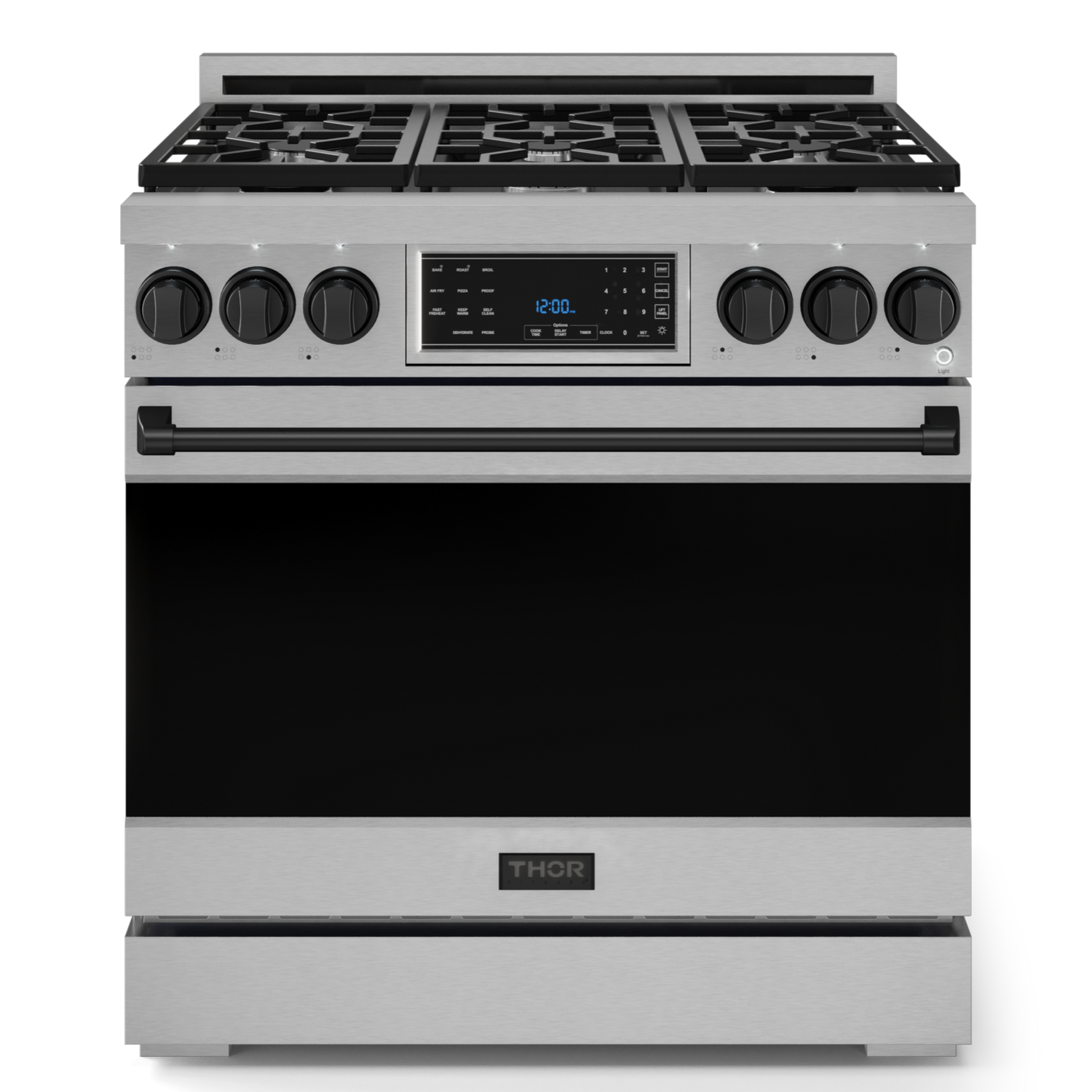 Gordon Ramsay by THOR Kitchen 36" 6.0 cu. ft. Professional Propane Gas Range with Tilt Panel Touch Control, Self-Clean and Air Fry in Stainless Steel with Black Accents, RSG36LP-BLK