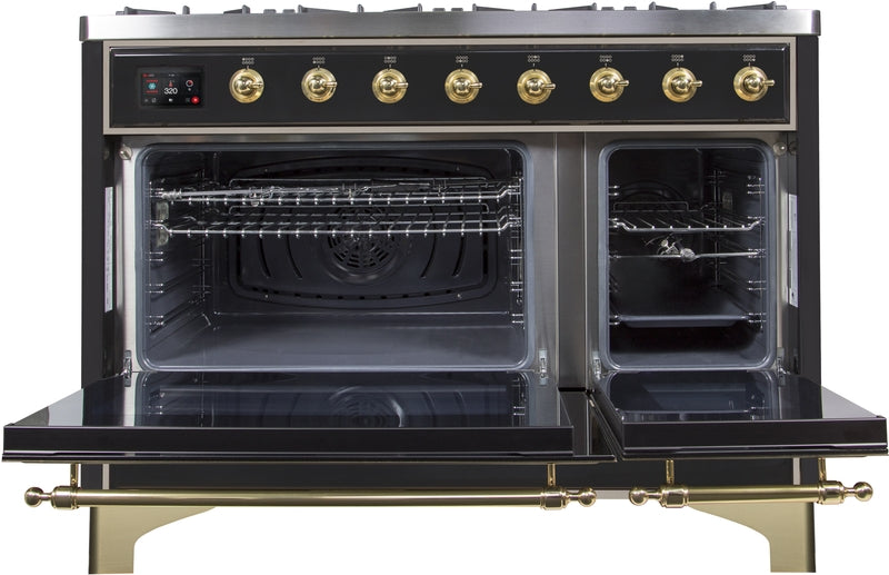 ILVE Majestic II 48" Dual Fuel Propane Gas Range in Glossy Black with Brass Trim, UM12FDNS3BKGLP