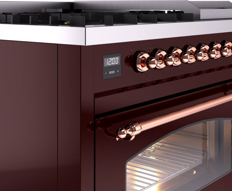 ILVE Nostalgie II 48" Dual Fuel Natural Gas Range in Burgundy with Copper Trim, UP48FNMPBUP