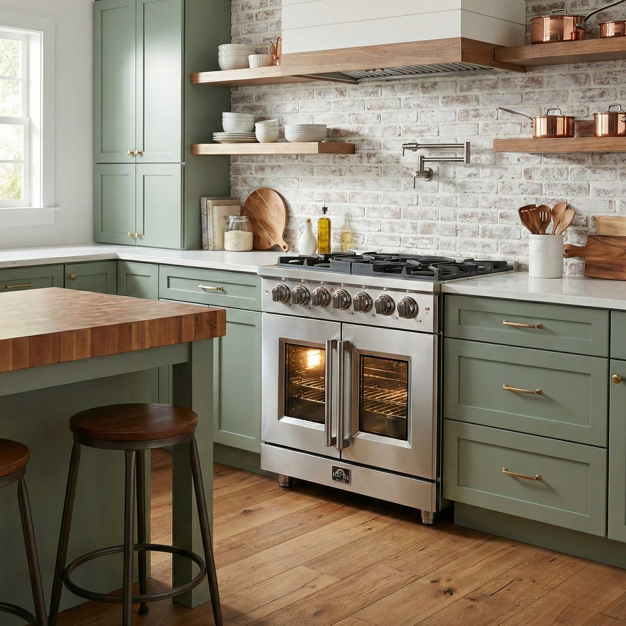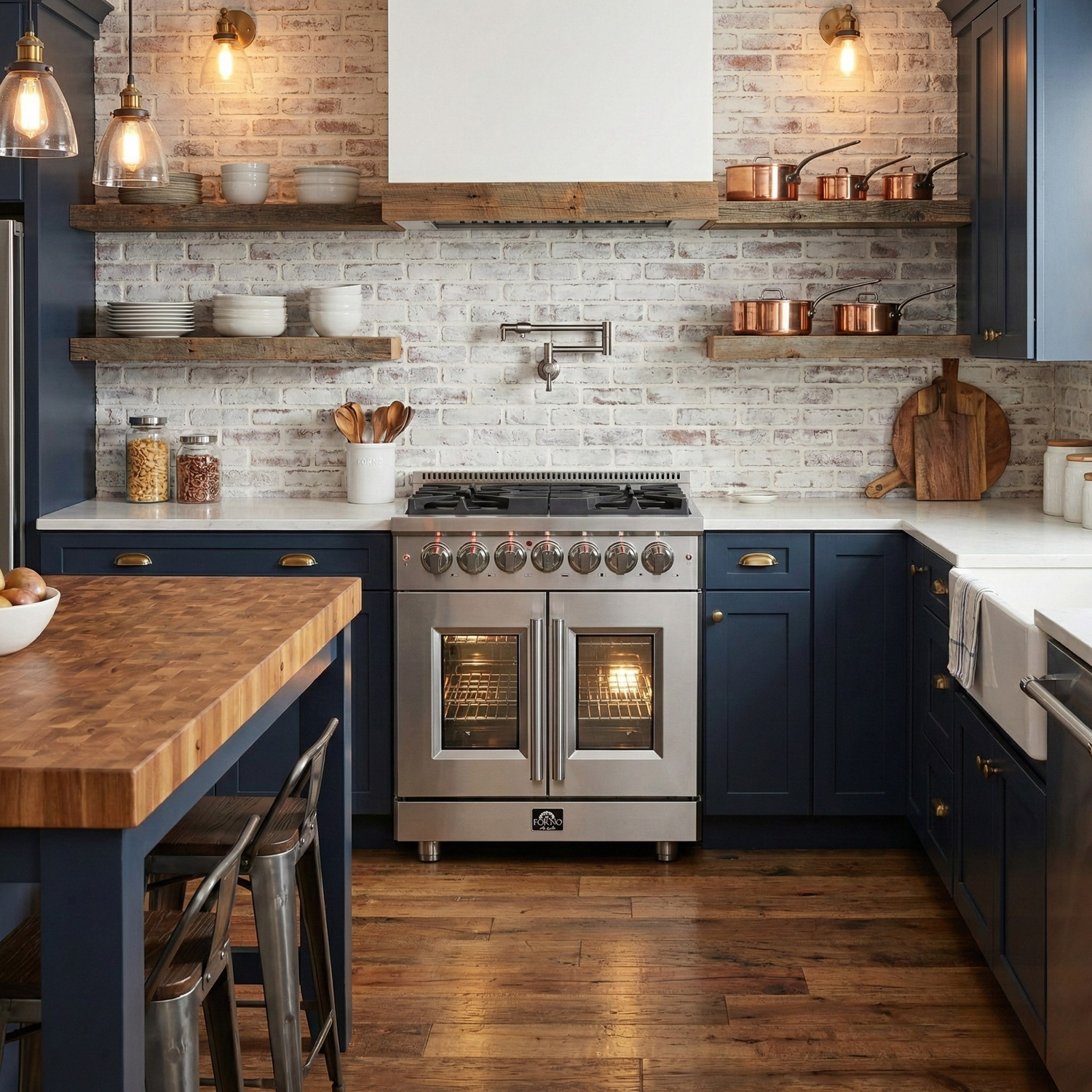 The Forno Massimo 30 Inch French Door Dual Fuel Range brings professional styling and performance into your home kitchen with its durable stainless-steel design. Unique French doors offer generous clearance of up to 12 inches or more, ensuring effortless access to your oven. The range top includes 5 sealed burners totaling 68,000 BTU, including a 20,000 BTU dual-ring brass burner capable of simmering at 1,000 BTU for delicate cooking. Heavy-duty continuous cast iron grates offer excellent cookware stability and mobility over a recessed enamel cooking surface that contains spills for easy cleanup. The 4.32 cu.ft. true convection oven features a speckled blue enamel interior, delivering fast, even cooking and easy maintenance. With 6,300 Watts of broil and bake output, this oven excels at roasting, baking, and broiling. A 3-layer glass oven door window provides heat retention and clear visibility. Accessories include 2 telescopic oven racks, wok support, griddle, air fryer kit with drip pan, NEMA 14-50P power cord, and LP conversion kit. Housed in high-grade stainless steel with illuminated zinc knobs, the Massimo combines elegant form and lasting function.