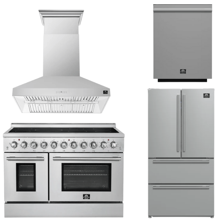 The Forno Paolo 48" Freestanding Electric Range in Stainless Steel combines power and polish for the modern kitchen. A smooth ceramic glass cooktop offers seven radiant elements with a combined 11,000 watts, while the spacious 6.7 cu. ft. black-enamel ovens use true convection with a 1,200-watt fan and high-output baking and broiling elements for fast, even results. Daily convenience comes from a hidden bake element for easy cleanup, bright halogen lighting, a large viewing window, a precise dual-element broiler, and a 100-watt warming zone for holding sides at serving temperature.