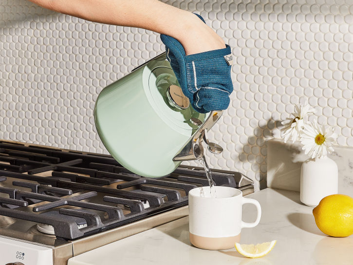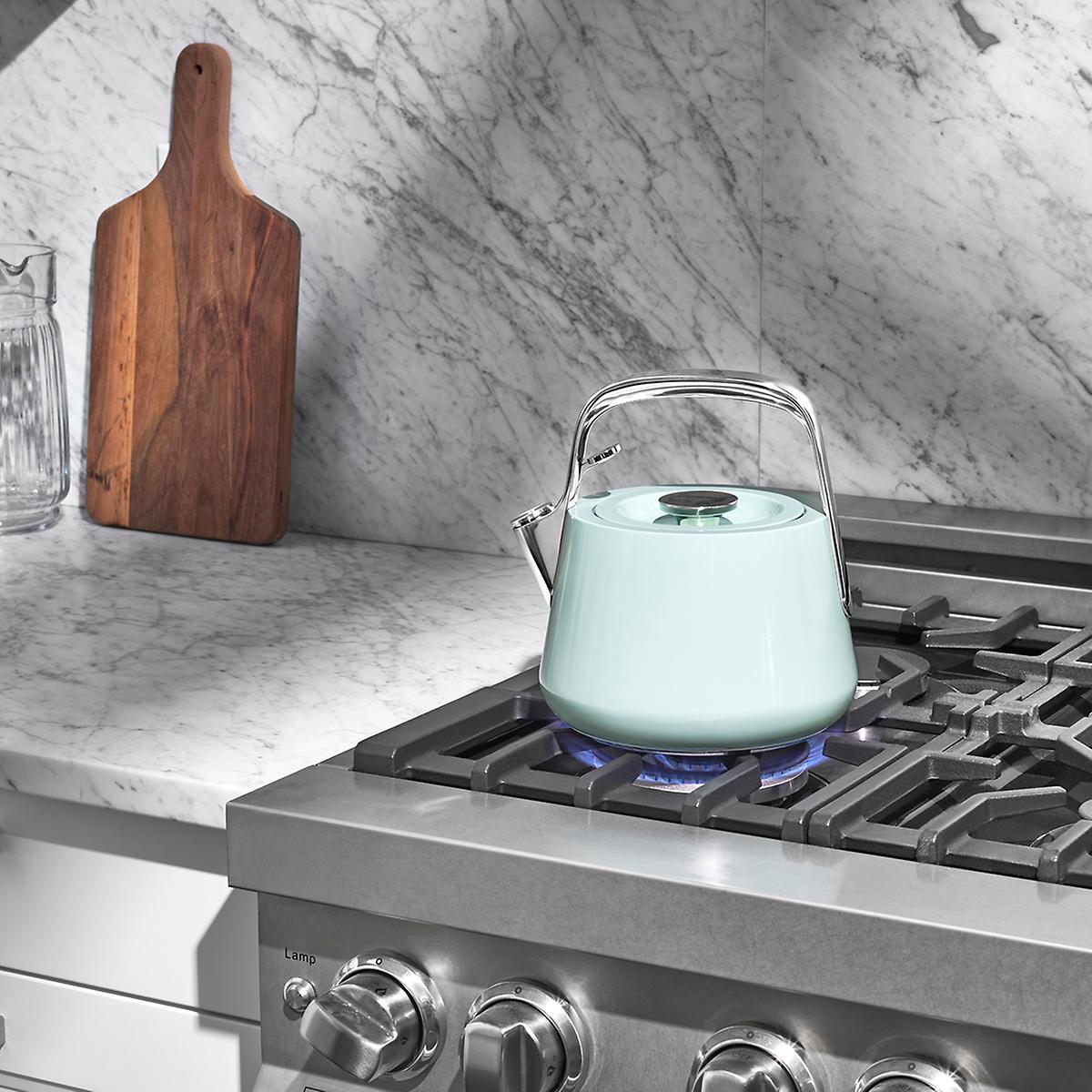 Meet your next Whistling Tea Kettle. Caraway’s Whistling Tea Kettle is a modern take on the classic kitchen essential, constructed with non-toxic materials to keep your boiled water clean and free of harmful chemicals. As easy on the eyes as it is on the ears, our durable stainless steel Tea Kettle is one worth whistling at. The beautiful and unique design will have your friends and family jealous of the mist-colored exterior and stainless steel handles...and yes...it's designed for fast boiling :)